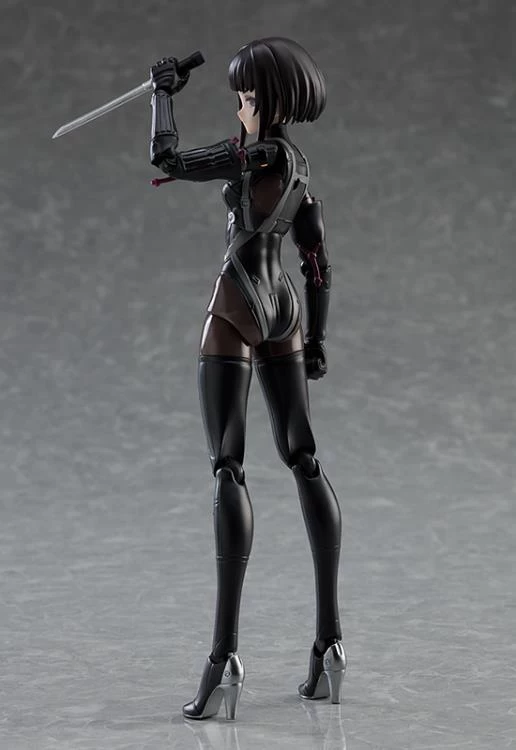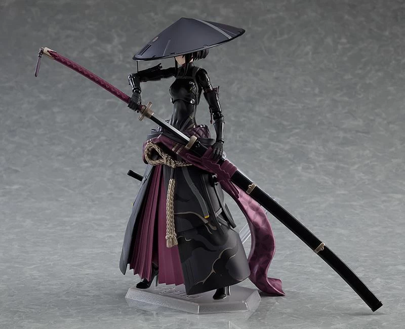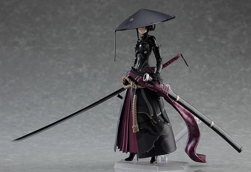 Her enormous odachi sword can be displayed being drawn out, while her tanto sword can be sheathed. She can be displayed wearing her roningasa hat with the use of an interchangeable head part as well. An interchangeable abdomen part and interchangeable thigh parts are included to display her with light equipment.