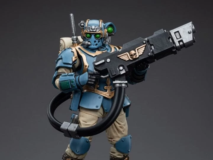 This is a 1/18 scale highly detailed, articulated figure based on Warhammer 40k’s Hot-Shot Volley Gunner of the Astra Militarum Tempestus 55th Kappic Eagles. The Volley Gunner figure stands about 4.20 inches tall and comes with several interchangeable parts and accessories, opening the door to a plethora of different and unique display opportunities.