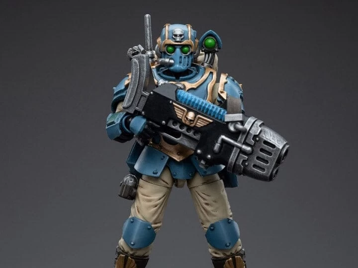 This is a 1/18 scale highly detailed, articulated figure based on Warhammer 40k’s Plasma Gunner of the Astra Militarum Tempestus 55th Kappic Eagles. The Plasma Gunner figure stands about 4.20 inches tall and comes with several interchangeable parts and accessories, opening the door to a plethora of different and unique display opportunities.